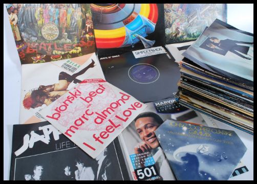Vinyl Records - A collection of vinyl long play LP and 12" singles featuring various artists to include The Beatles Sgt Peppers picture disc, Electric Light Orchestra Out Of The Blue on blue vinyl, Elton John, Dire Straits Promo, David Bowie, Bronski Beat, B52's, Beach Boys and many many more.