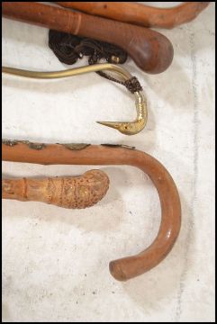 A collection of vintage walking sticks canes from the 20th Century together with a stunning silk parasol with the handle modelled as a Crane.
