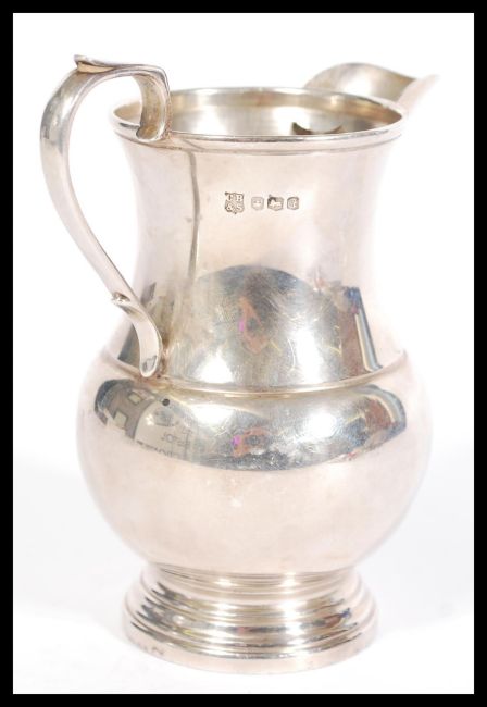 A 20th Century silver hallmarked creamer jug having a shaped handle and a stepped round base. Hallmarked Sheffield Cooper Brothers & Sons 1973. Weight approx 167.8g. Measures 12cm high 11cm wide.
