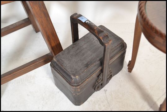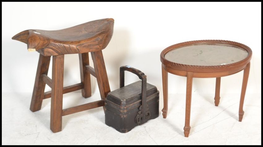 A 19th century Chinese ebonised carry / food box. Sectional interior, with decorative carved handle brackets together with a Chinese elm wood fish stool. Raised on squared legs with upper and lower stretchers having an unusual large rusting polished elm wood seat of shaped fish form and an unusual early 20th century Chinese carved side table. Raised on shaped legs with oval table top having detailed carved panel in relief of a dragon within clouds having glass top above. The oval top with gadrooned borders to the edges. Measures 61cm high x 65cm wide x 33cm deep