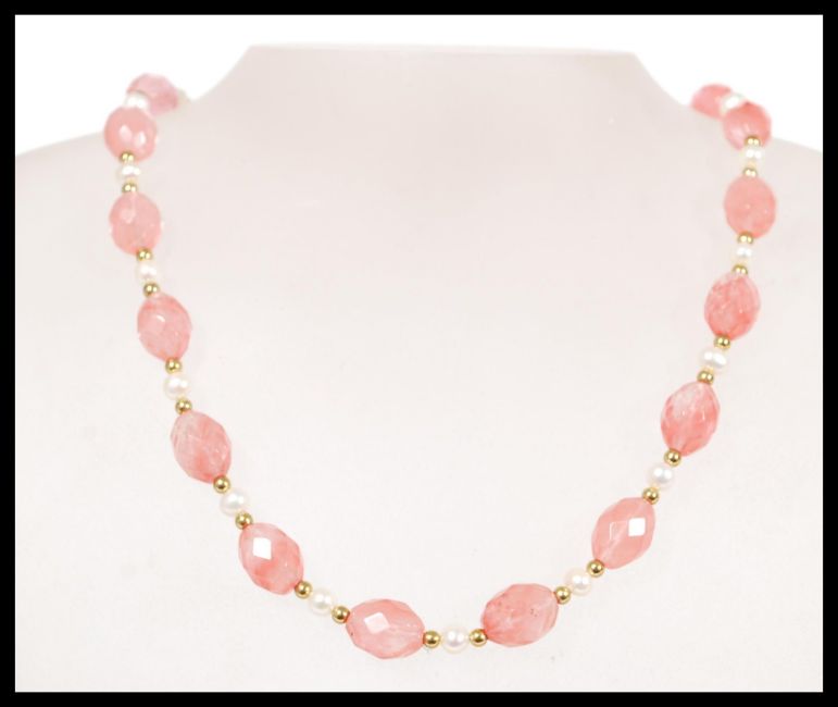 A necklace of rose quartz faceted beads with pearl spacers along with a pair of matching earrings. 46cm long.