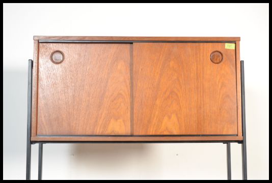 Avalon - A retro mid 20th century teak wood sectional metal framed modular wall system. The black metal uprights supports a series of cabinets and shelves etc