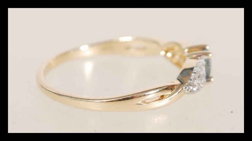 A hallmarked 10ct gold ring having a crossover design set with a central green stone and white accent stones. Import hallmarks. Weight 1.8g. Size O.