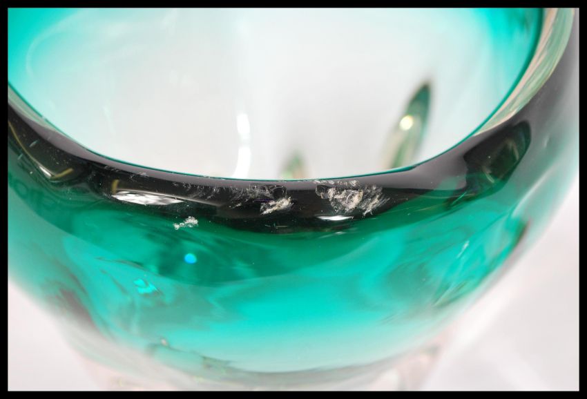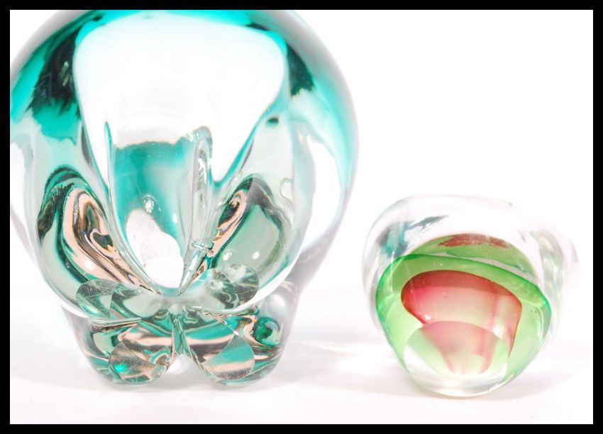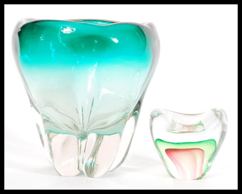 A large substantial vintage ' Molar ' art glass vase in a two tone colourway, together with a vintage glass dump vase of similar design. Tallest 17cm high 15cm diameter.