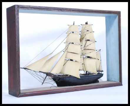 An early 20th Century scratch built model of a sailing ship at full mast, set within an ebonised display case ( no glass ). Measures 45cm high 61cm wide.