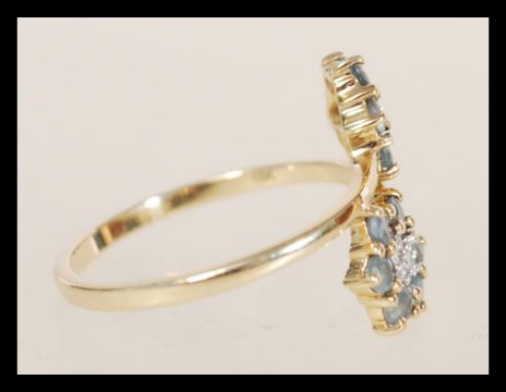 A hallmarked 10ct gold ring having a double flower head design set with white and green stones. Import hallmarks. Weight 2.1g. Size O.