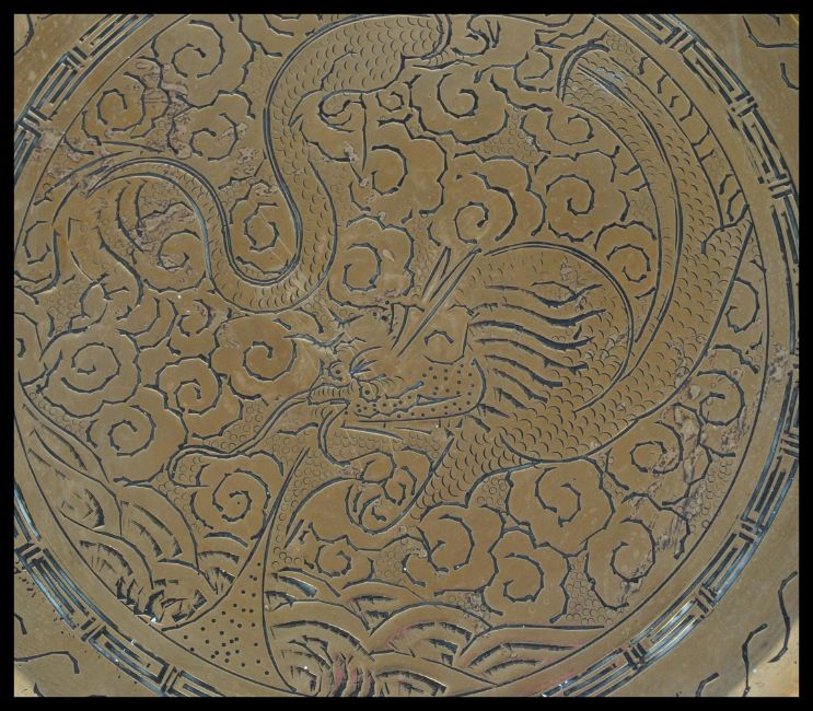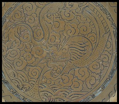 A 19th Century Chinese brass charger plate of circular form having decoration of dragons and scrolls. Measures 41cm diameter.