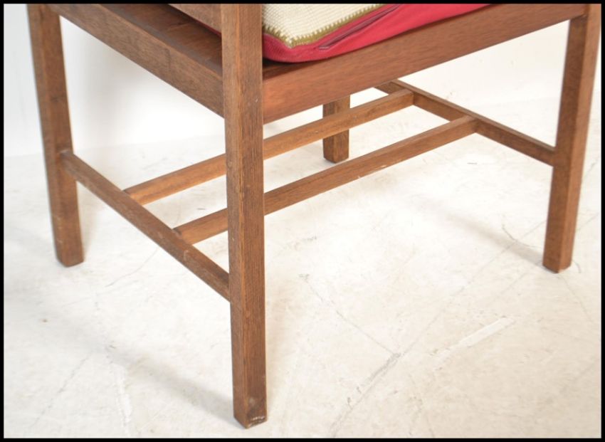 A 20th century Arts & Crafts  / Shaker revival teak wood armchair raised on squared legs with panel seat and railed gallery back rest and elbow supports. Measure:  86cm high x 60cm wide x 57cm deep.