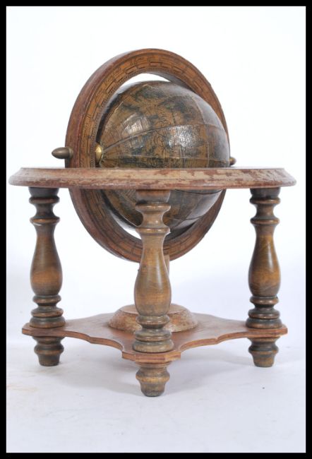A vintage 20th Century desk globe antique style desk globe raised on a stained wood gimbal stand with turned legs. Measures 20cm high.