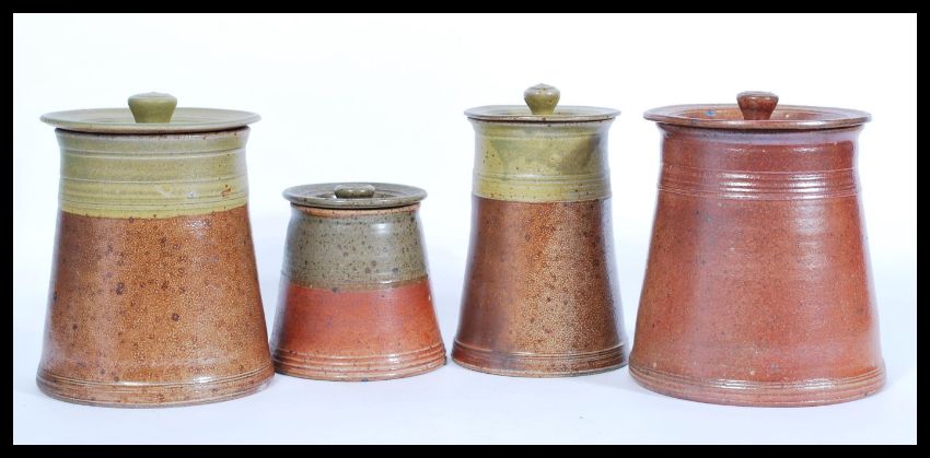 A selection of early 20th Century stoneware pottery storage jars / pots of cylindrical form with lids having ball finial lids. Tallest 20cm high.