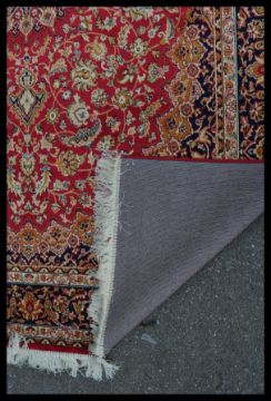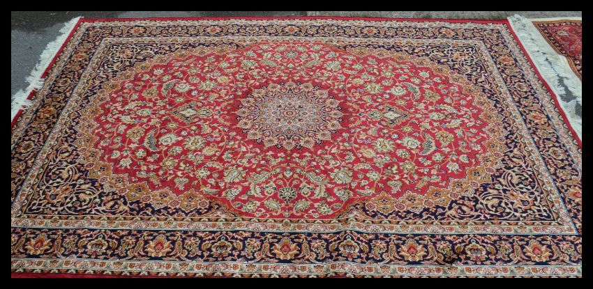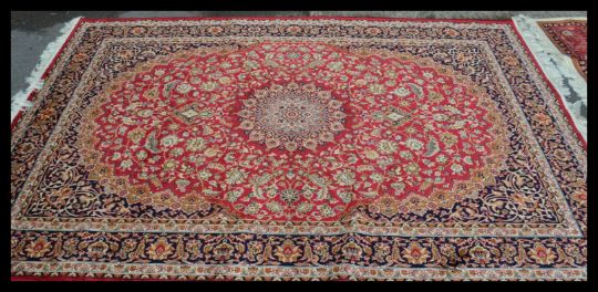 A large Persian floor carpet Keshan rug having a red ground with geometric borders and medallions. Measures 230cms by 160cms.