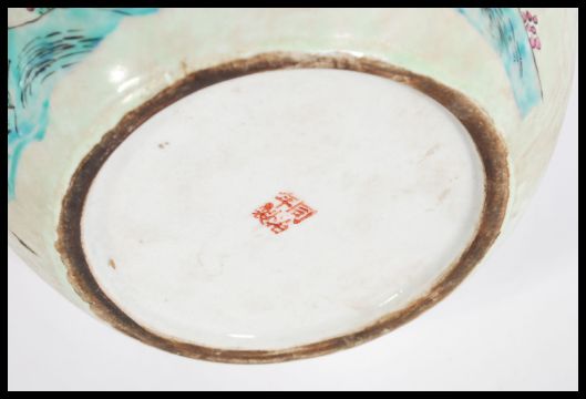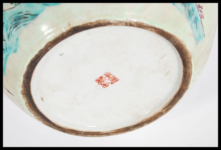 A late 19th century Chinese large baluster vase having hand painted decoration of children playing in gardens with Famille Verte trees. The globular body having tapered neck and four ochre red character marks to base. Measures 34cm high.