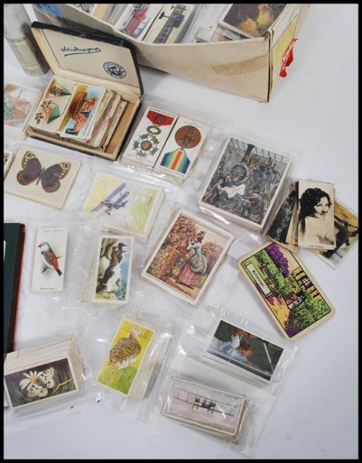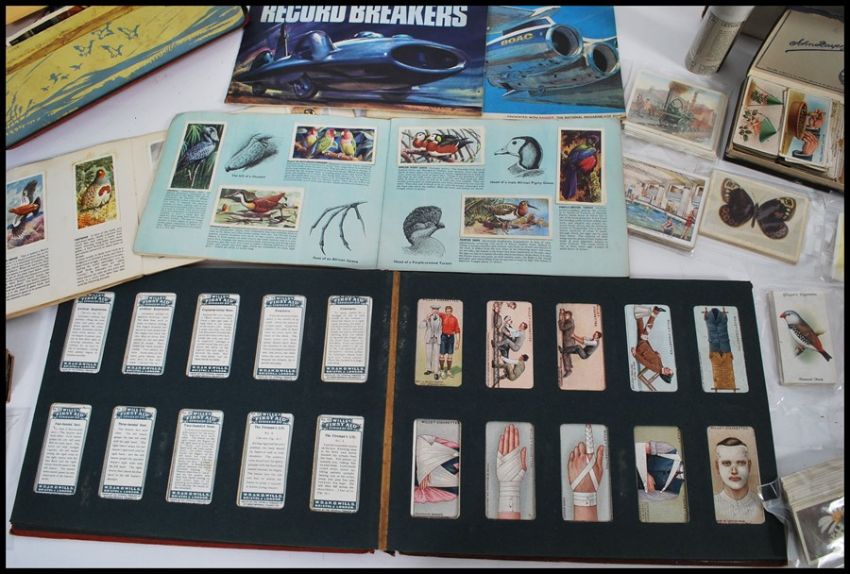 A collection of cigarette and tea cards dating from the 1920's to include Wills Cigarettes First Aid cards, film stars, military, birds, fauna  etc