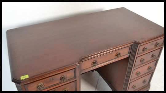 A 19th century heavy solid mahogany inverted twin pedestal desk. Raised on ogee  bracket feet with drawers to each pedestal flanked inverted breakfront kneehole centre with further drawer. Measures: 77cm high x 120cm wide x 61cm deep.