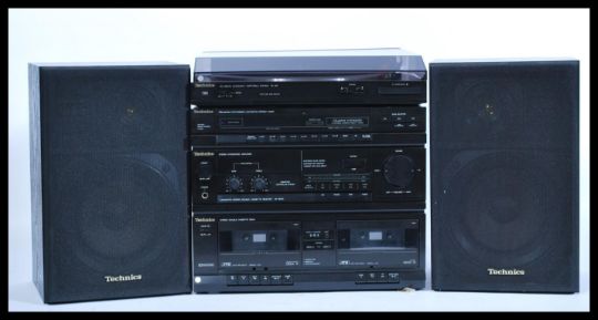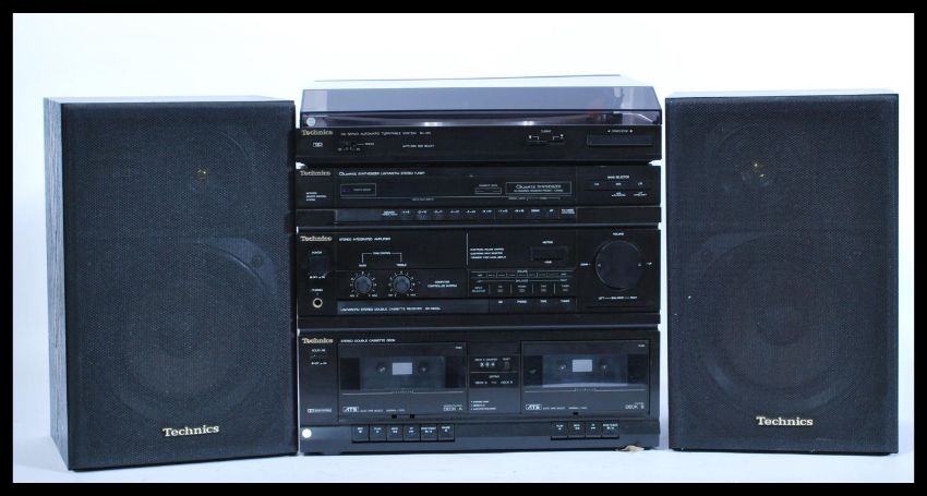 A 20th Century Technics music stacking system, consisting of record deck, tape deck, radio receiver with a pair of matching  speakers. Speakers measures 26cm high.