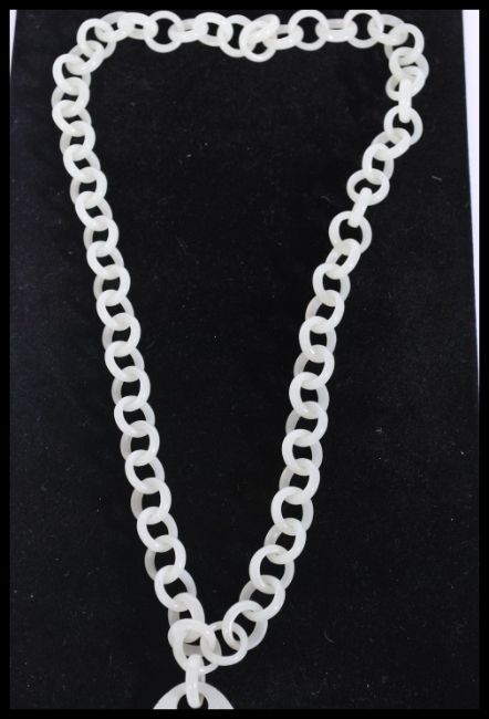 A Chinese hand carved Devil's Work jade necklace and pendant of long form with large panel pendant depicting birds of paradise and feathers. Pendant measures 8cm high 5cm wide.