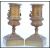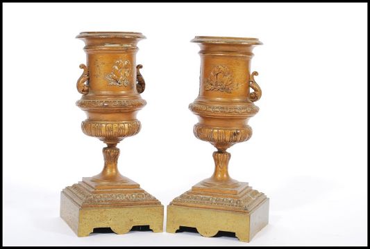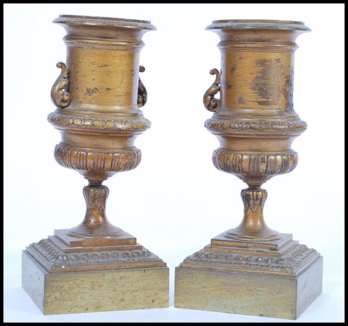 A pair of 19th century bronze urns raised on square bases with decorations of swags and ribbons with scrolled handles and wreath decoration. Measures 22cm high 9cm wide.