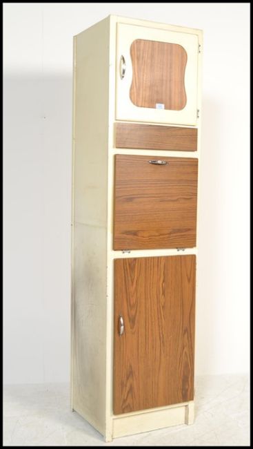 A mid century retro vintage two tone upright kitchen pedestal cabinet. The white body with faux wood facia comprising cupboards, drawers and fall front centre. Measure:  172cm high x 44cm wide x 41cm deep.
