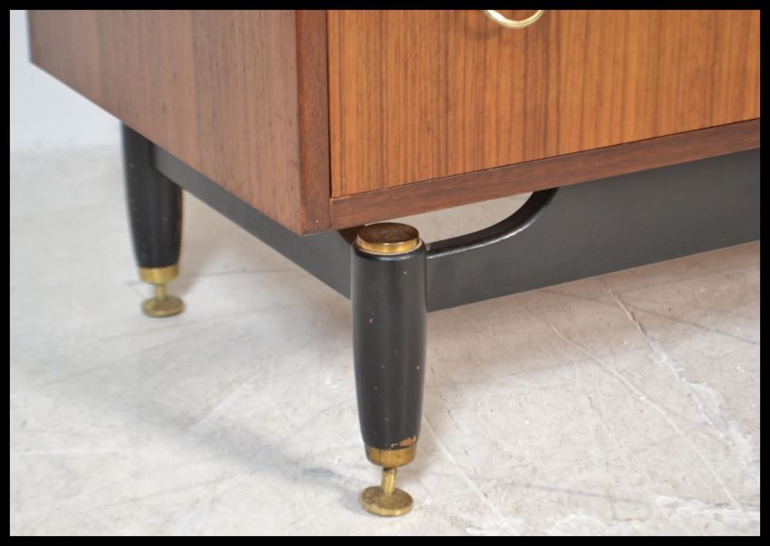 G Plan Ernst Gomme for G Plan Tola wood / teak wood chest of drawers, a double bank of four drawers, eight in total, the configuration of eight drawers having four short and four deep with fitted brass handles, raised on ebonised suspension supports. Gold stamp to drawer.Measures: 87 cm high X 149 cm wide X 46 cm deep.