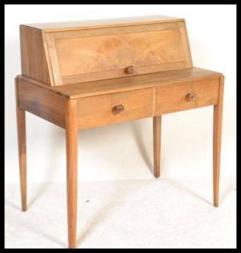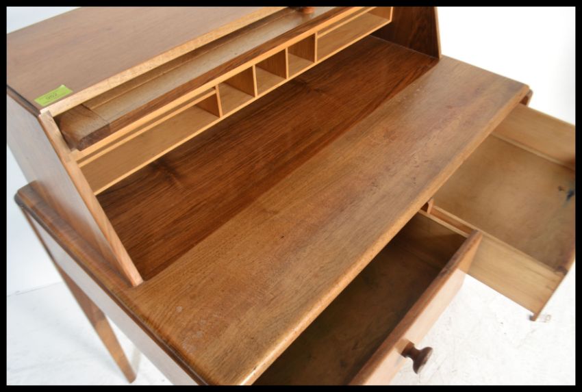 A mid century Cotswold School walnut retro bureau office desk by Arthur Reynolds, Ludlow being raised on tapering legs with drawers and appointed bureau atop. Measures: 100cm high x 92cm wide x 56cm deep.