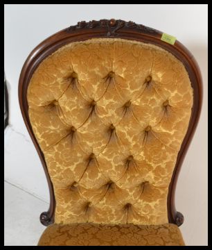 A Victorian 19th century mahogany spoon back nursing chair of rococo form raised on scrolled legs with white ceramic castors having  a show wood frame being upholstered in a yellow chenille fabric. Measures: 98cm high x 51cm wide.