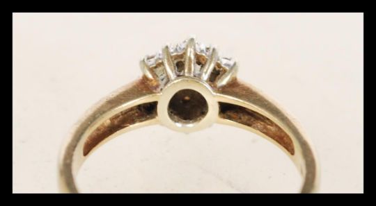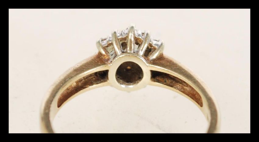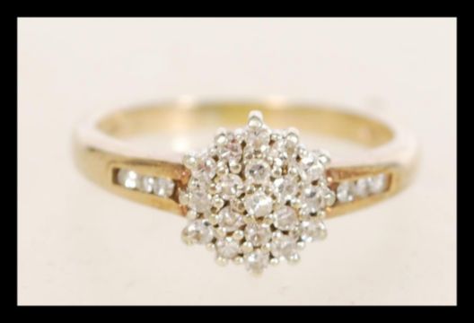 A hallmarked 9ct gold diamond cluster ring having a central flower head with diamond encrusted shoulders. Weighs 3.1 grams size P.