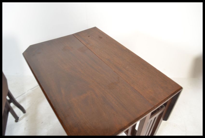 A near pair of Edwardian mahogany Sutherland table / tables being raised on squared legs with railed centres having drop leaves raised on gate leg action. Measures: 57cm high x 50cm deep.