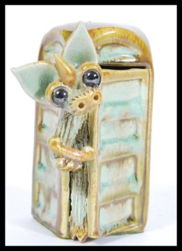 A Yare pottery dragon figurine depicting a dragon emerging from a phone box. Measures 11cm high.