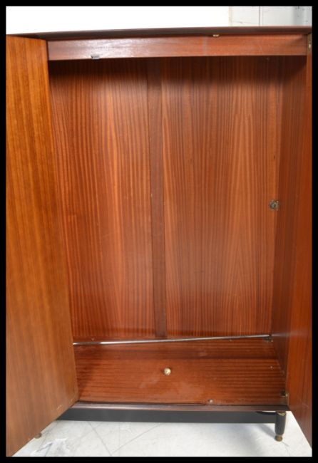 Ernst Gomme for G Plan Tola wood triple door / bi fold door wardrobe in the Librenza pattern, hanging rail to inside with suspension set ebonised base on turned legs, together with G Plan bed shelved and cupboard head board.Wardrobe measures: 171 cm high X 122 cm wide X 57 cm deepHeadboard measures: 84 cm high X 197 cm wide X 34 deep.