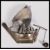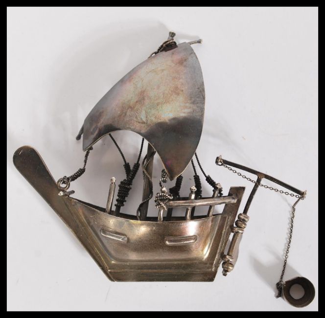 A silver / white metal model of a sailing box complete with sails moving bucket, rudder and ropes. Measures 13cm high 13cm wide.