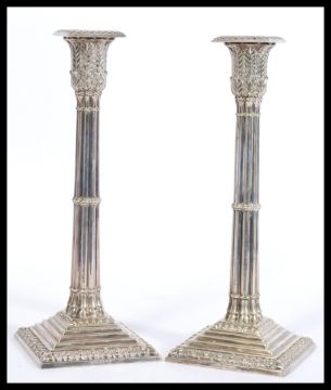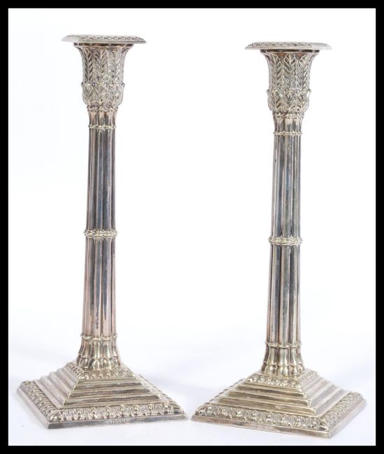 A pair of Mappin & Webb silver plated candlesticks having square stepped bases with moulded decoration to the rims and reeded decoration to the columns with acanthus leaf sconces having square moulded tops. Measures 27cm high.