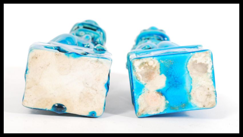 A pair of Oriental Chinese 20th Century ceramic temple lion dogs of Fu in blue raised on square pedestal bases.