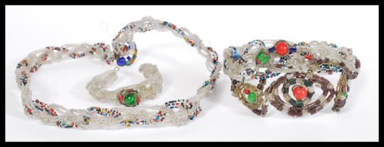 A vintage 1920's Art Deco beaded headband composing of multi coloured plaited threaded glass beads along with a matching belt and bracelet. 67cm longest.