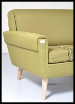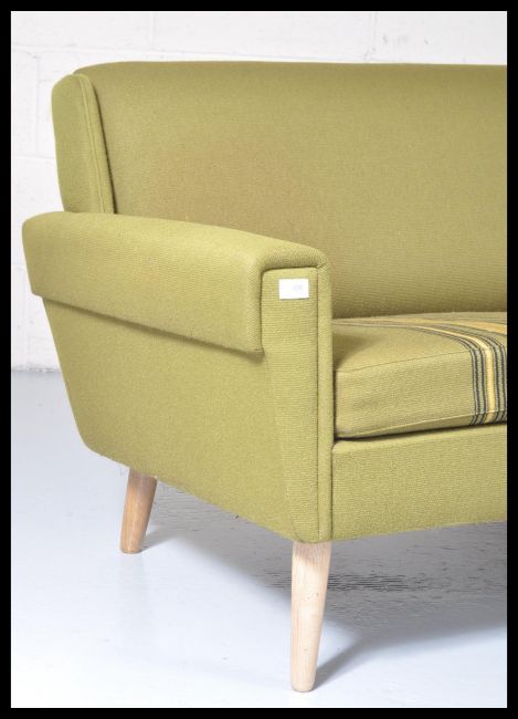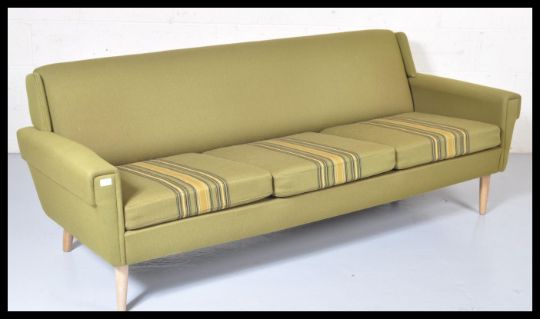 A mid 20th century retro vintage Scandinavian three seat sofa settee having an angular and winged frame upholstered in olive green upholstery with striped seat cushions. The sofa raised on beech wood tapering legs. Measures; 70cm x 200cm x 70cm.