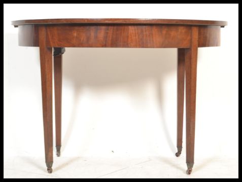 A 19th century George III mahogany d-end console hall table. Raised on square tapering legs , above a fitted frieze with flared edge console table top above. Measures: 75cm high x 117cm wide x 58cm deep.