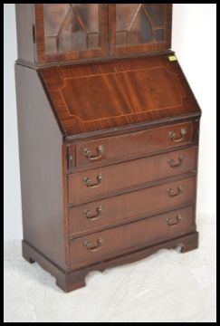 A 20th century mahogany bureau library bookcase being raised on shaped base with a bank of drawers having appointed interior with astragal glazed bookcase cabinet above. Flared cornice atop. Measures: 187cm high x 75cm wide x 42cm deep.