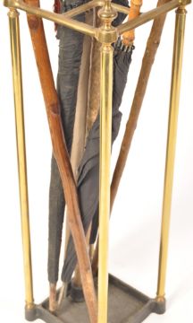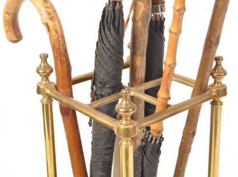A Victorian 19th century brass stick stand of square form. Raised on cast iron drip tray base with tubular upright frame with finial tops over the qtr section toprails. Complete with a selection of gentleman's walking sticks and umbrella's. Measures 68cms x 20cms