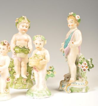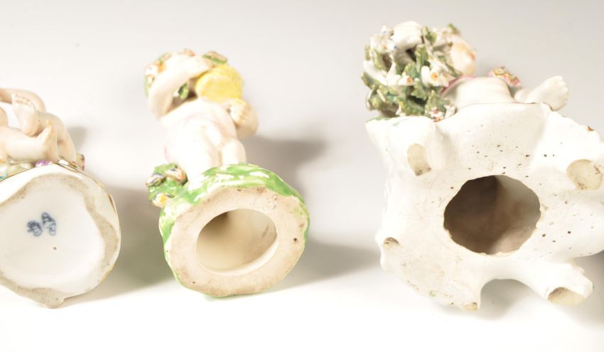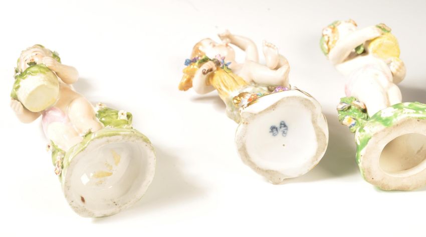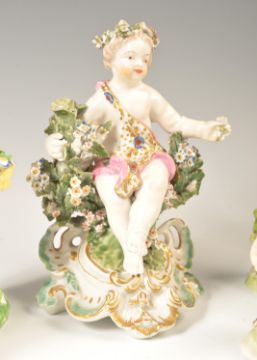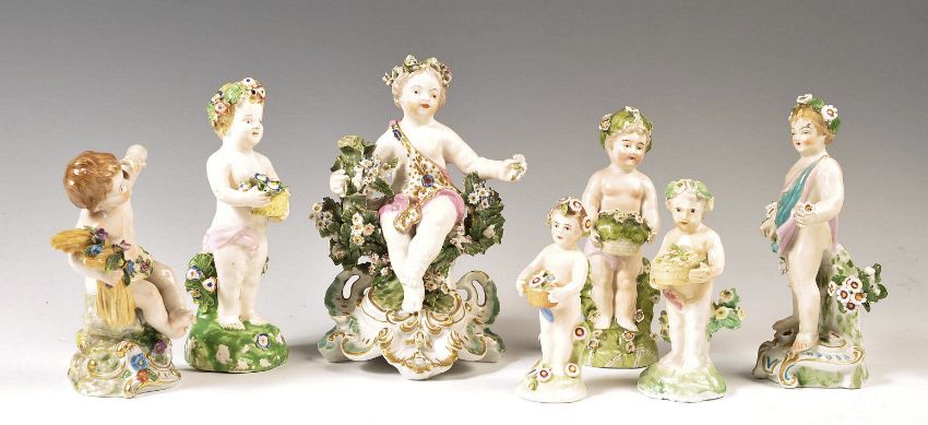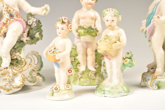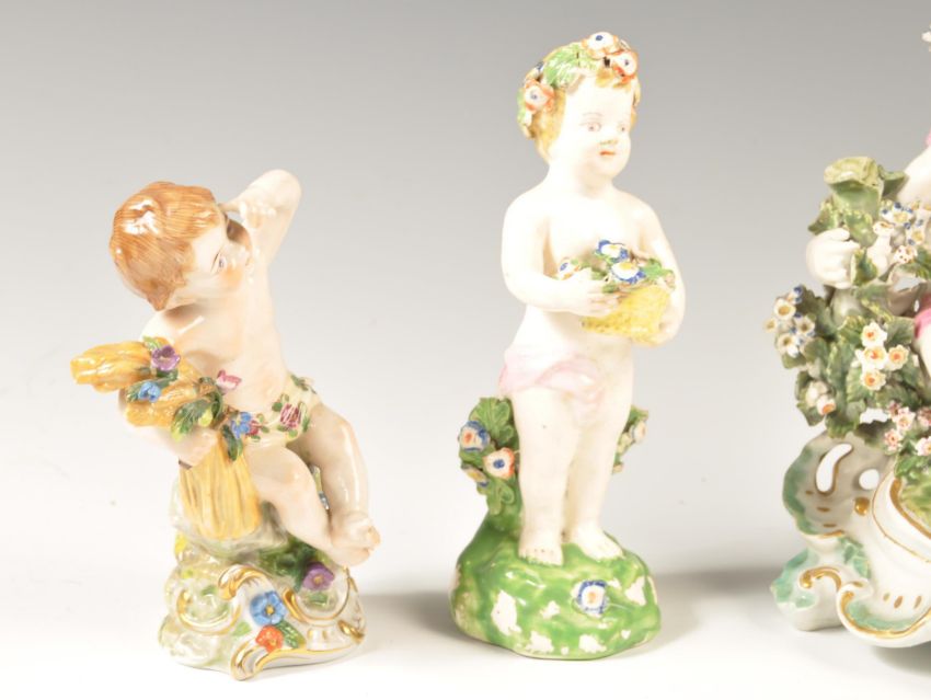 A collection of 19th century porcelain figurines of cherubs. The collection to include encrusted floral cherub seated, many with baskets of flowers. Believed German, possibly Dresden, one with gold anchor mark likely Samson of Paris. 7 in total, largest measures 17cms tall