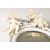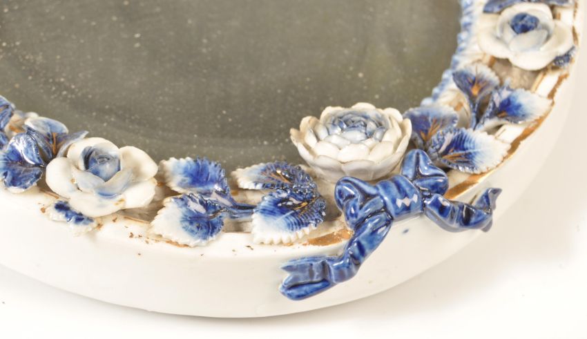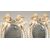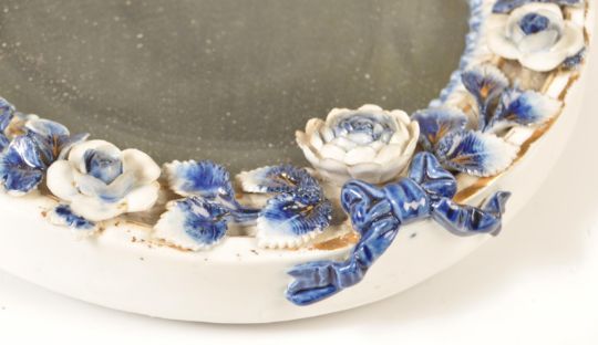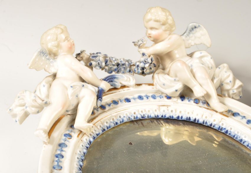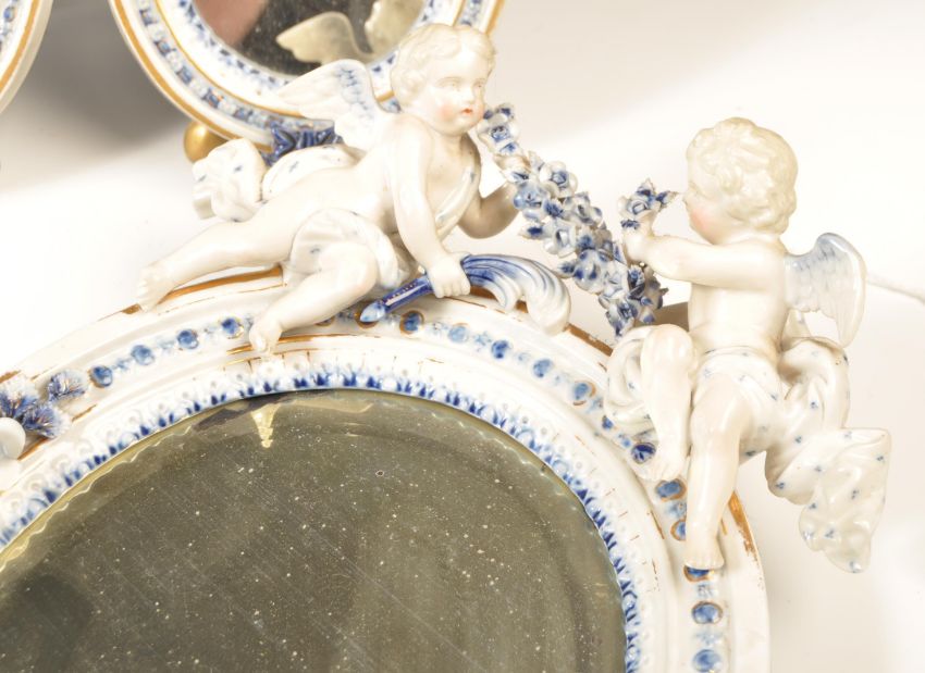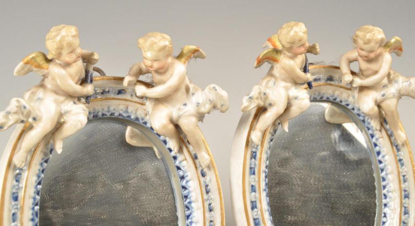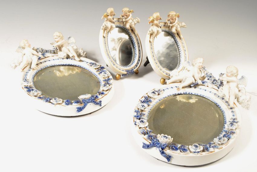 A set of four 20th century German Sitzendorf blue and white porcelain cherub and floral encrusted barbola wall and easel mirrors. Each with winged putti over oval frames encrusted with flowers. The two smaller examples having wooden back panels with easel backs and the larger pair having wooden back panels with ring mounts. Blue stamped cross marks to top of larger pair R marks to smaller pair. Measures 28cms x 22cms and 17cms x 12cms.