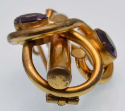 A late Victorian amethyst set brooch. The brooch being set with two oval cut amethyst within a stylised knot having C clasp and T bar hinge. Measures 3.5 x 3cms.  Total weight 12.5g. Estimated carat weight 4.83ct and 2.47cts.