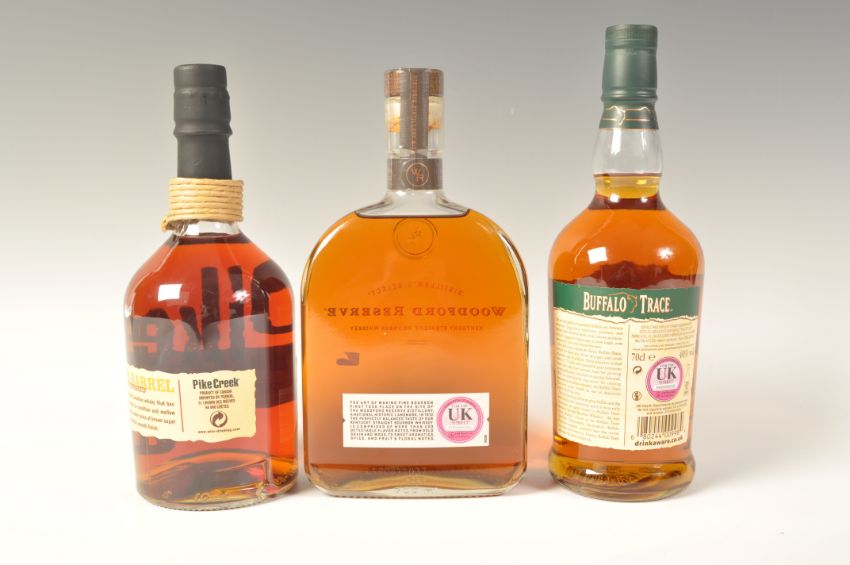 A group of three bottles of whisky to include Woodford Reserve Kentucky Straight Bourbon Whiskey 70cl 43.2%, Buffalo Trace Kentucky Straight Bourbon Whisky 70cl 40% and Pike Creek 10 year old whisky 70cl 42%.