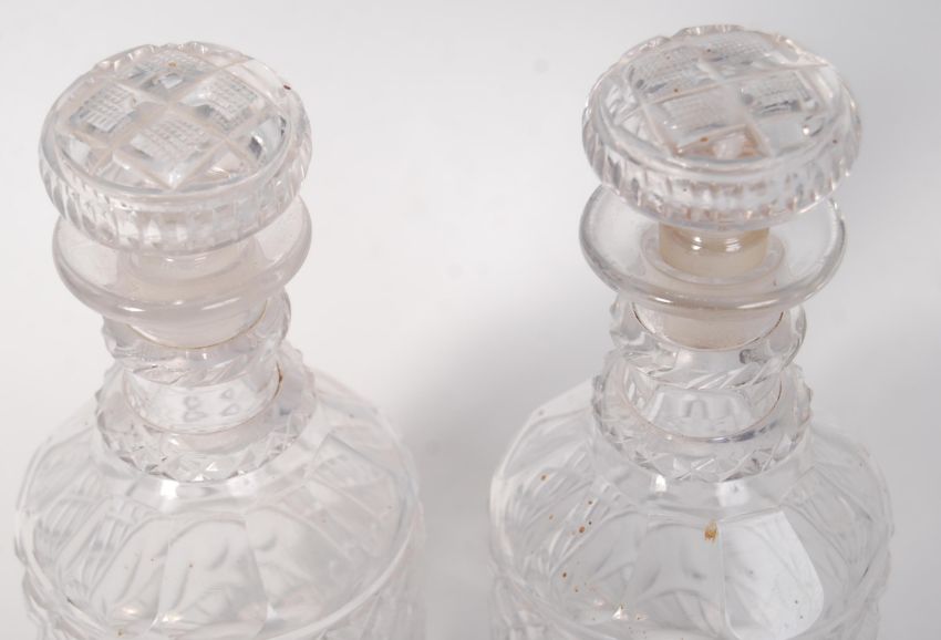 A pair of early 19th century small cut glass travelling decanters. Each of ovoid form with facet cut detailing being complete with the stoppers to each. Measures 20cms high each