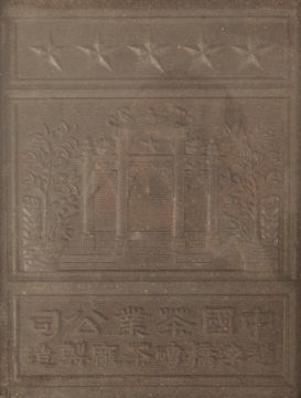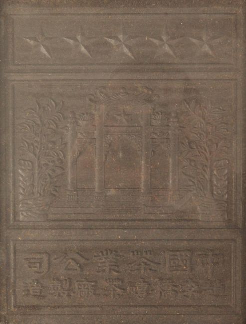 An early 20th Century Chinese block of black powder tea having central panel depicting archways and trees with two rows of character marks and five stars to topped. Held within a double sided gilt glazed frame revealing 16 blocks to verso. Measures 31cm x 26cm.