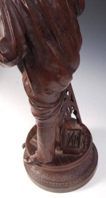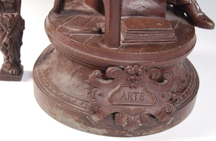 A large 19th century bronzed spelter sculpture / figure of an sculptor at work being raised on a socle plinth with armorial cartouche marked ' Arts ' Measures 63cms high