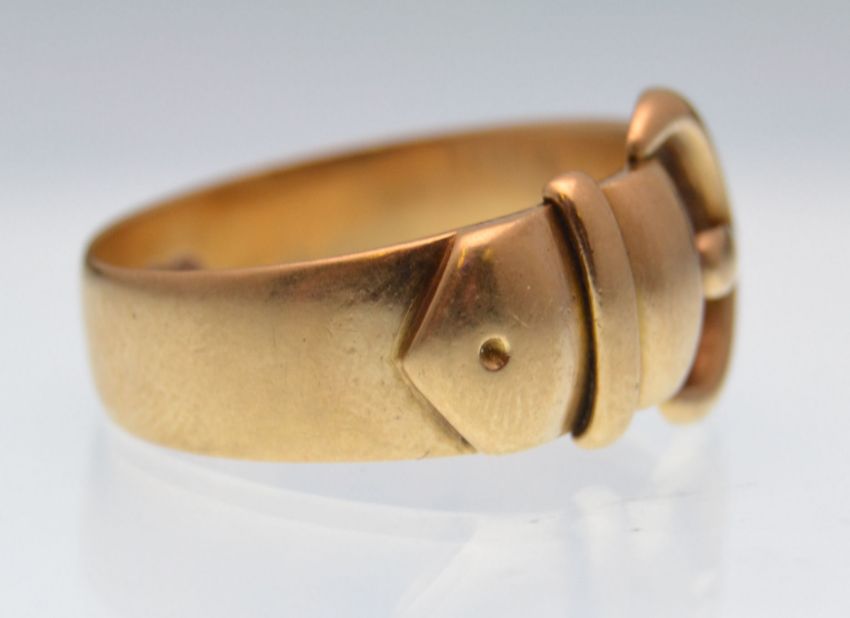 A hallmarked late Victorian 18ct gold buckle band ring. The ring being hallmarked Birmingham 1886 for Deakin and Francis. Weight  7.2g. Size Q.