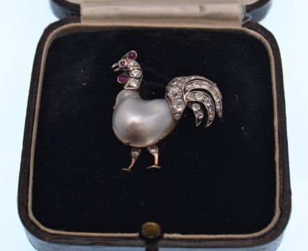 An early 20th century ruby, pearl and diamond figural brooch in the form of a cockerel. The brooch having a baroque pearl body with old cut and rose cut diamond encrusted tail feathers and cabochon ruby and old cut diamond set head with rose cut diamond set thighs. Completed with a roller fastener and fitted case. Weight approx 5.7g. Measures 2.5cms