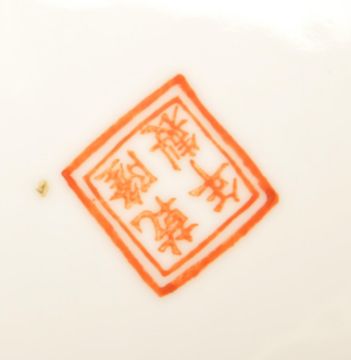 An early 20th Century Chinese Republic period charger plate of circular form having hand painted central cartouche depicting building with trees, river, figures and boat. The central image bordered by famille jaune and turquoise borders with hand enamelled floral medallion sprays/ Four ocher red character marks to base inside ocher square. Measures 33cm wide.