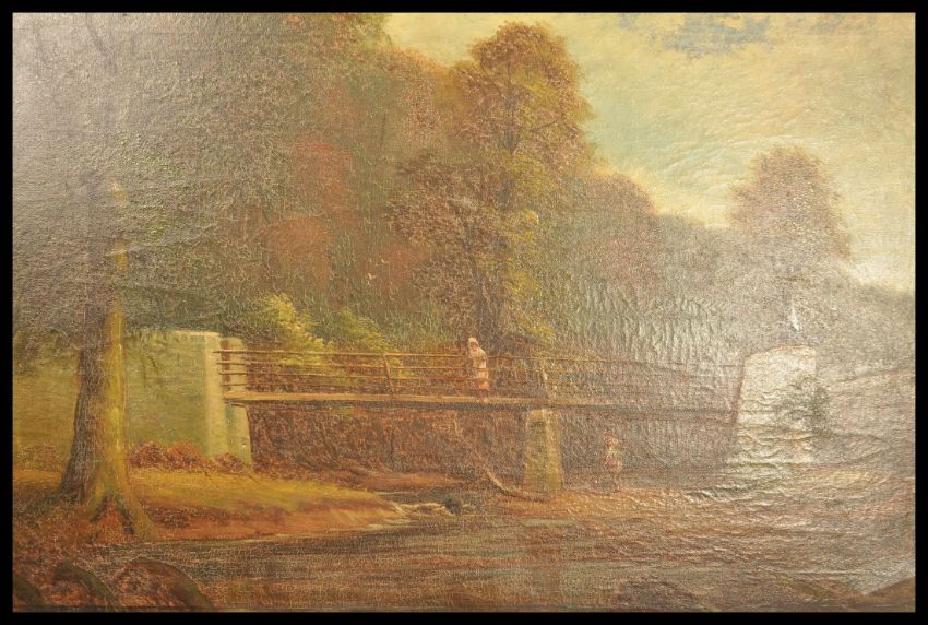George Harris (British, 1855-1936) An oil on canvas painting of Snuffy Jacks bridge, Snuff Mills, Stapleton, Bristol. Otherwise known as Ha'penny bridge. Signed to the corner and set within a good gilt frame. Measure 85cms wide x 54cms high ( canvas )