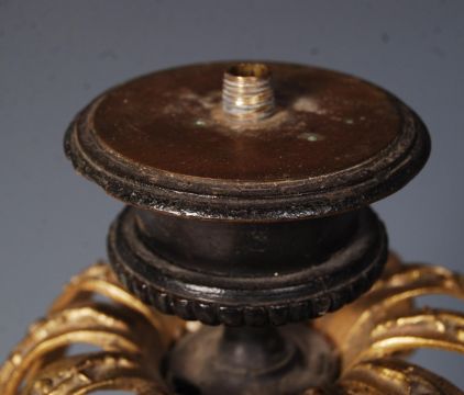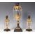 An early 19th century William IV 3 piece lustre garniture - candelabra. The large central stick with gilt eagle surrounded by facet cut glass drops with single sconce candle holder above. The matching smaller pair with gilt rococo overhangs and facet cut glass drops with single sconces above. Largest measures 41cms high / smallest 23cms high
