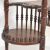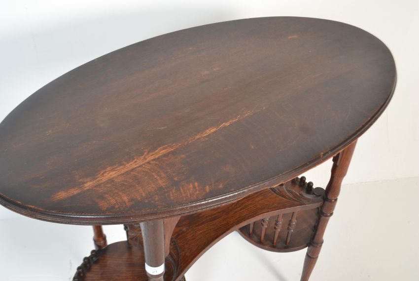 A Victorian Arts & Crafts oak side  / wine table in the manner of Edward William Godwin. The table raised on turned tapering legs with finial feet. The lower tier with carved foliate edges having drop circular tiers with spindle galleries and acorn finial borders. Above an oval lozenge shaped table top. Measures 75cms x 84cms x 46cms